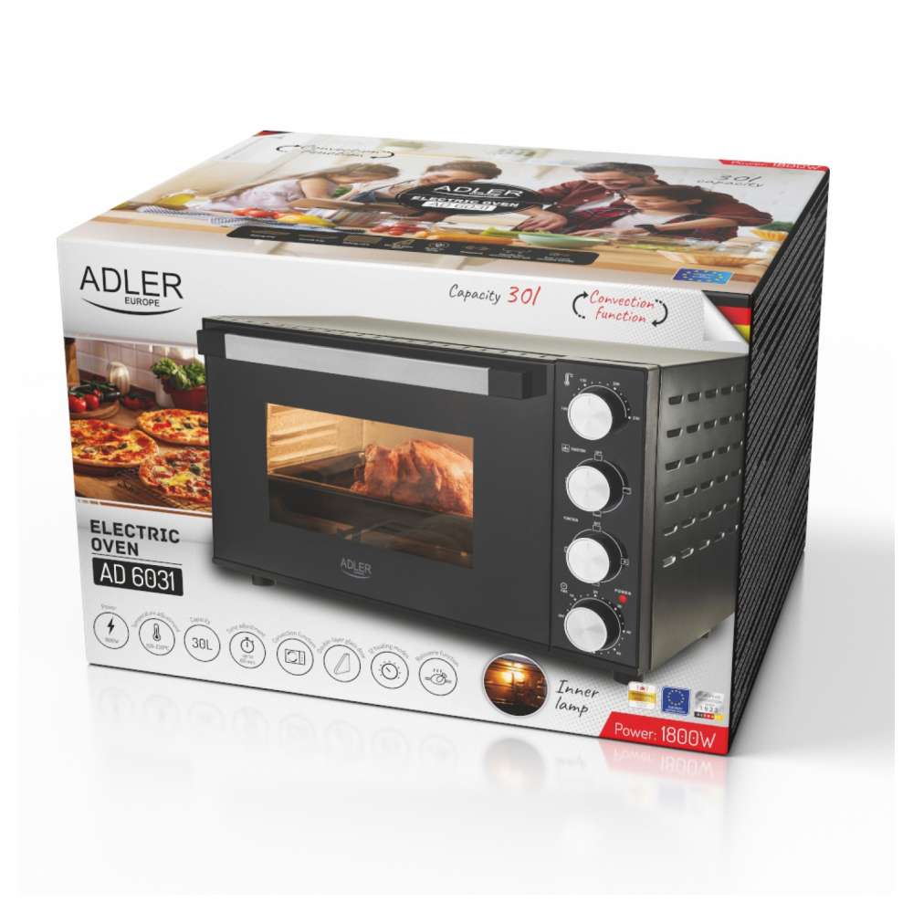 Pripremiti svoja omiljena jela uz AD6031 mini pećnicu sa tajmerom, ventilatorom i ražnjem. Prostrana je i idealna za svakodnevno kuvanje kod kuće, stanovima ili vikendicama. Možete uz pomoć nje i njenih dodataka da napravite bilo koji recept. Idealno je za pečenje: mesa, kolača i sl. Funkcija konvekcije omogućava ravnomernu cirkulaciju toplote i savršeno pečene proizvode i hrskavu koru. Boja: crna. Moderan dizajn. Uklapa se sa ostatkom elemenata.