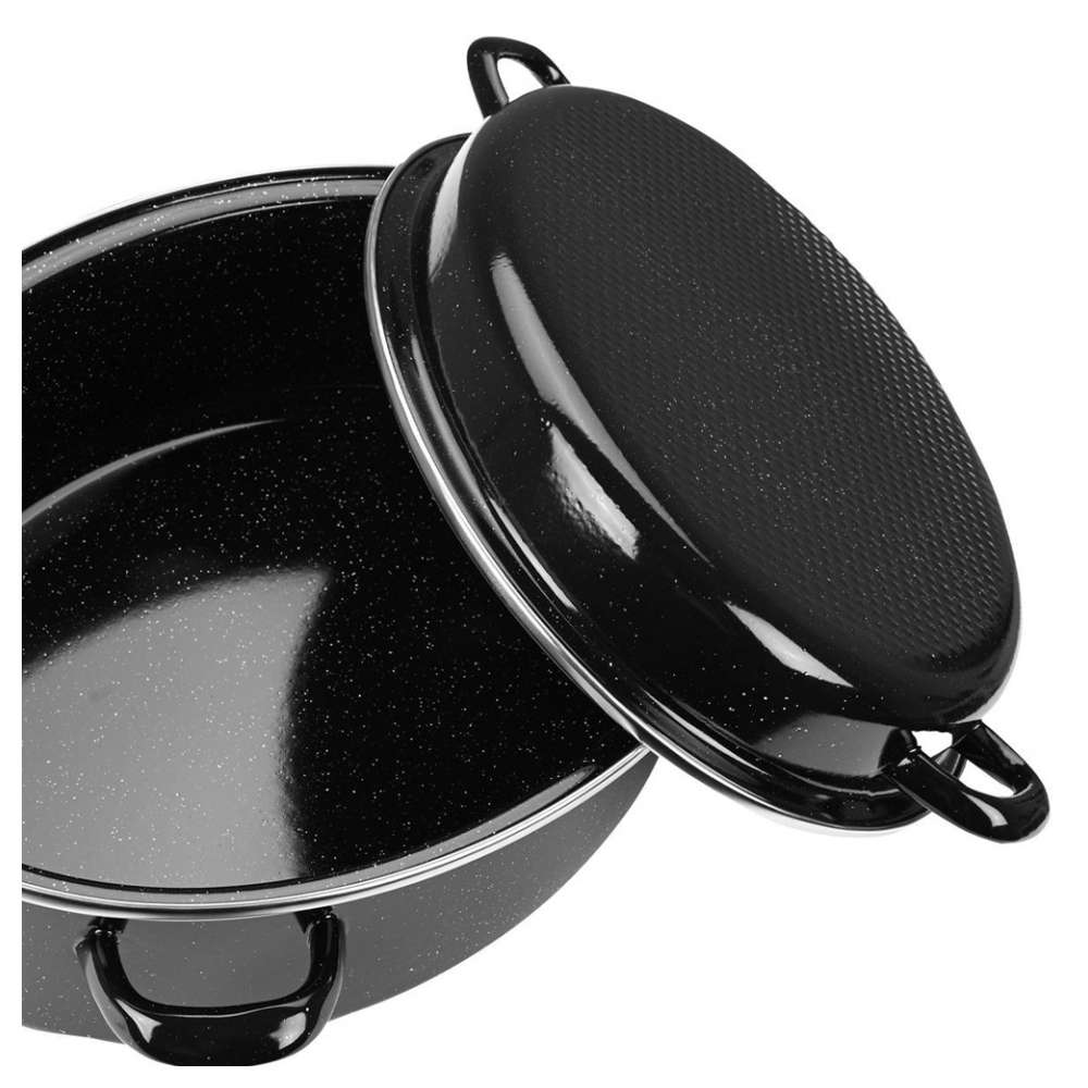 ESTIA ES01-8154 pekač sa poklopcem ovalni je napravljen od visokokvalitetnog ugljeničnog čelika debljine 0,7 mm. Nude ravnomernu distribuciju temperature zahvaljujući pari unutar tepsije. Ima ručke za udobno držanje kao i visoku otpornost na ogrebotine, mrlje i udarce. Boje je crne i lako se uklapa. Ima emajlirani premaz i duboki poklopac koji se takodje može koristiti kao samostalno posudje ili za serviranje.