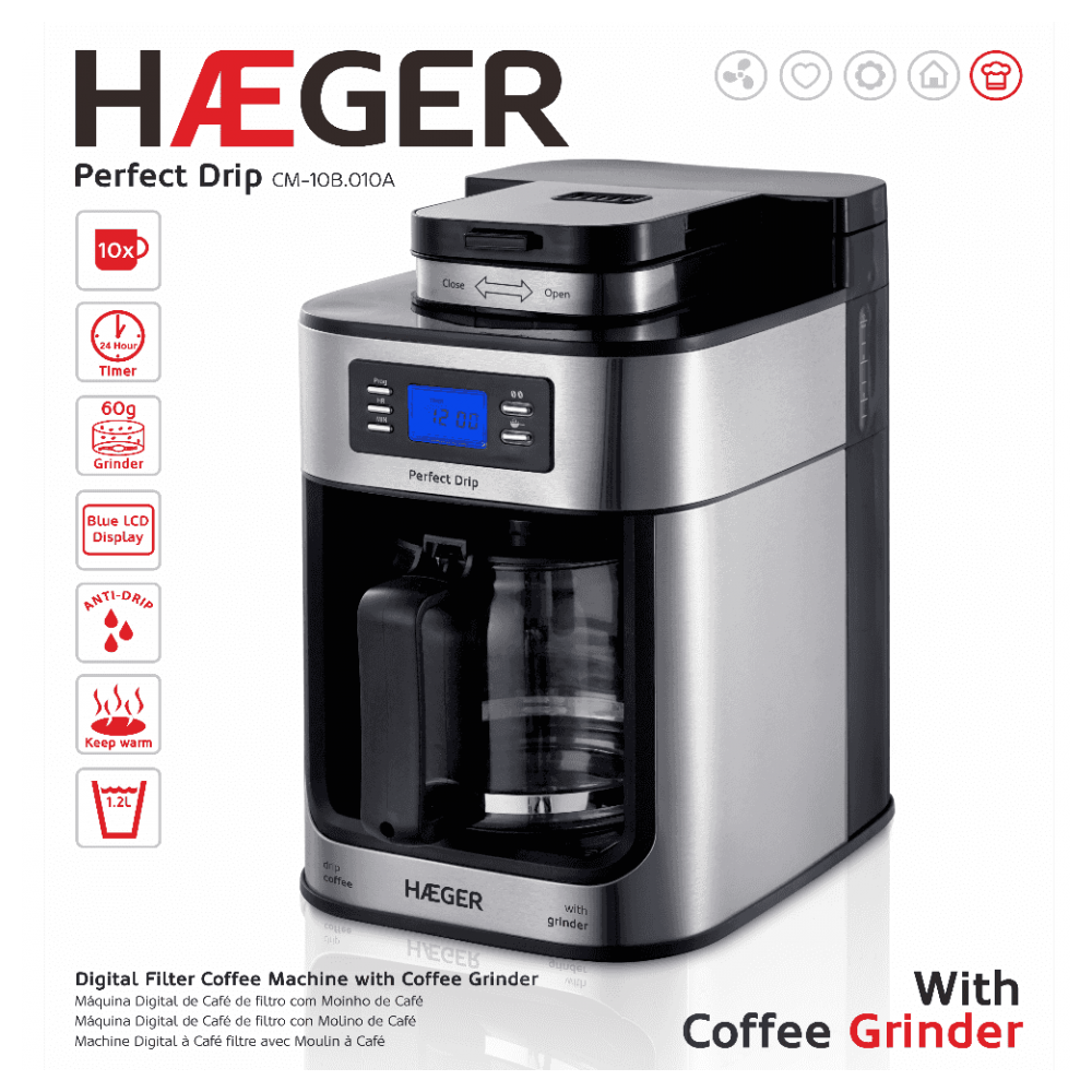 Haeger CM-10B.010A je aparat za filter kafu dizajniran za ljubitelje kafe koji cene kvalitet i jednostavnost upotrebe. Sa velikodušnim rezervoarom za vodu od 1,25 litara, omogućava pripremu do 10 šoljica kafe odjednom, što ga čini idealnim za svakodnevnu upotrebu ili društvena okupljanja. Mašina poseduje LCD ekran koji omogućava jednostavno rukovanje i programiranje funkcija. Sa izlaznom snagom od 1050 vati, obezbeđuje brzo i efikasno kuvanje kafe. Aparat za kafu kombinuje funkcionalnost sa privlačnim dizajnom u crnoj i srebrnoj boji što ga čini elegantnim dodatkom svakoj kuhinji.