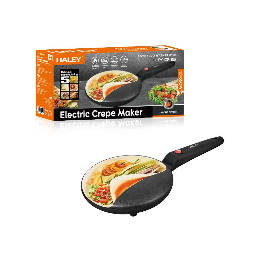 HALEY HY1045 aparat za palačinke omogućava ravnomerno pečenje zahvaljujući preciznoj kontroli temperature i kvalitetnoj neljepljivoj površini. Snaga od 650W obezbeđuje brzo zagrevanje i efikasnu pripremu, dok dizajn uređaja omogućava jednaku debljinu svake palačinke. Vodootporno kućište dodatno povećava praktičnost i sigurnost tokom upotrebe.