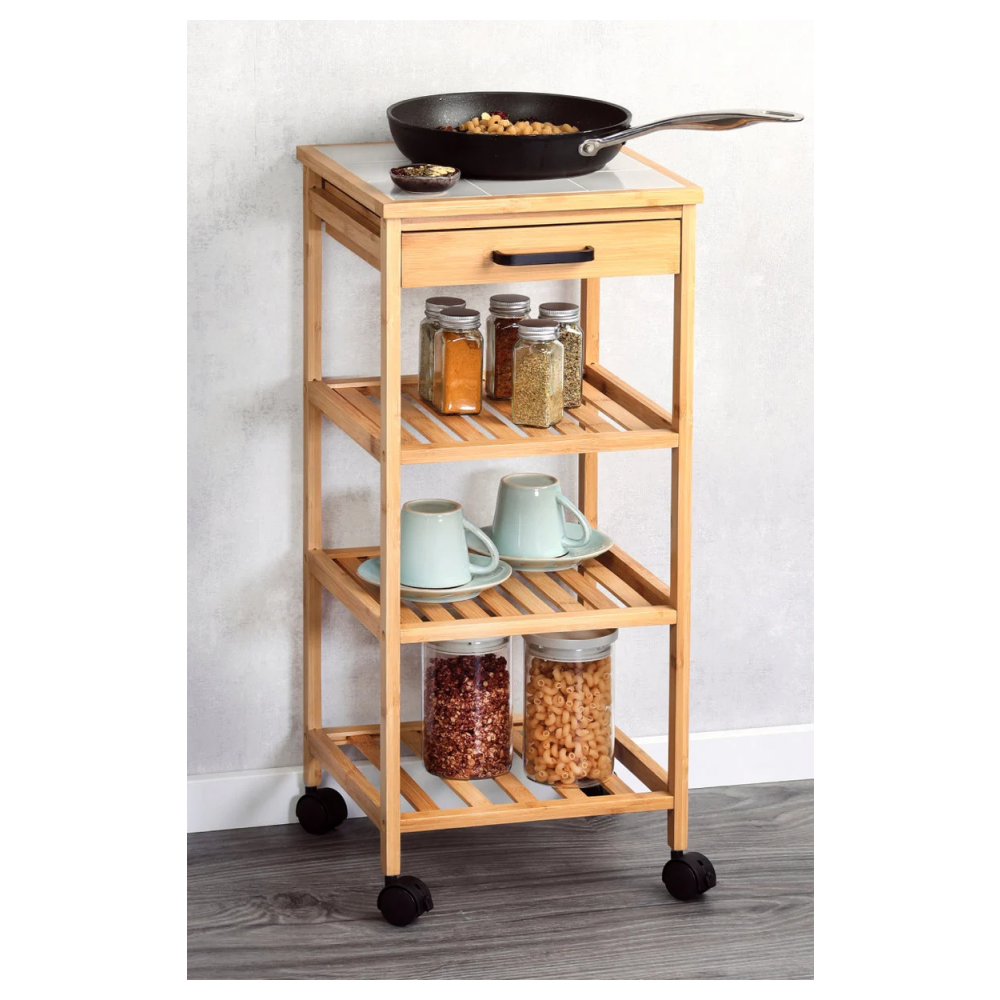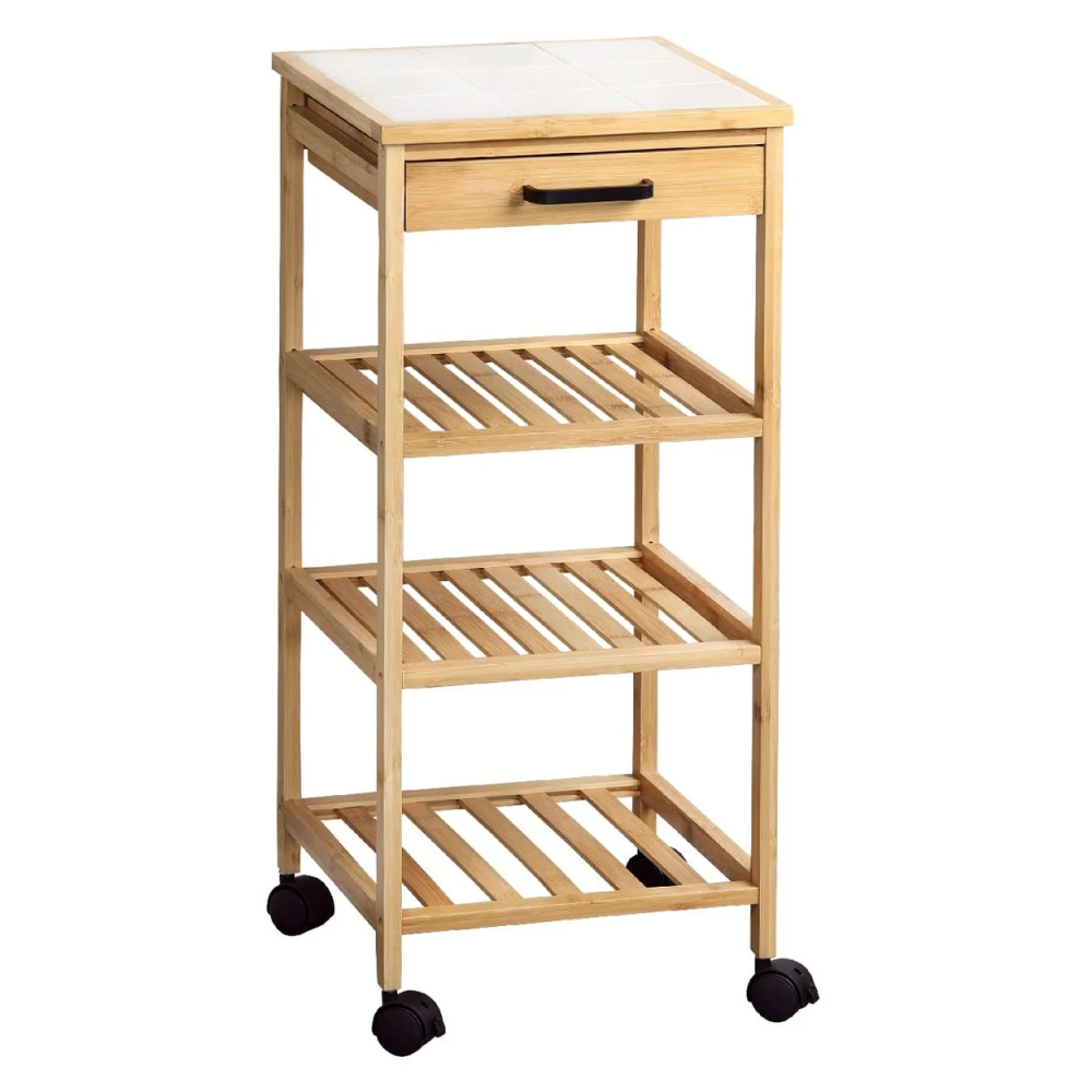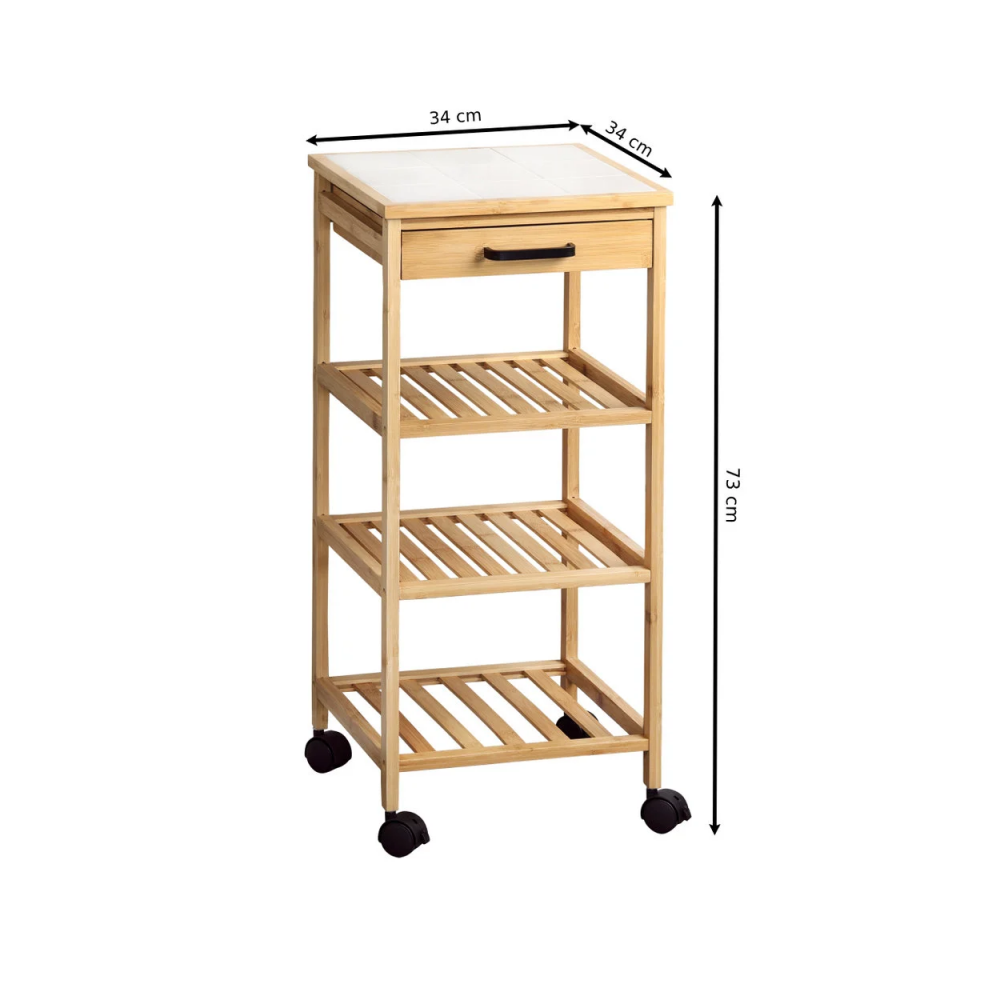 KESPER KSP25774 VIŠENAMENSKA POLICA - Praktična i elegantna kuhinjska kolica od bambusa pružaju dosta prostora za skladištenje i istovremeno štede prostor. Napravljen od bambusa sa FSC® sertifikatom, garantuje visoku izdržljivost i prirodan izgled. Kolica su opremljena fiokom i tri prostrane police, koje omogućavaju efikasnu organizaciju kuhinjskog pribora. Zahvaljujući okretnim točkovima, lako se kreću i fleksibilna su.