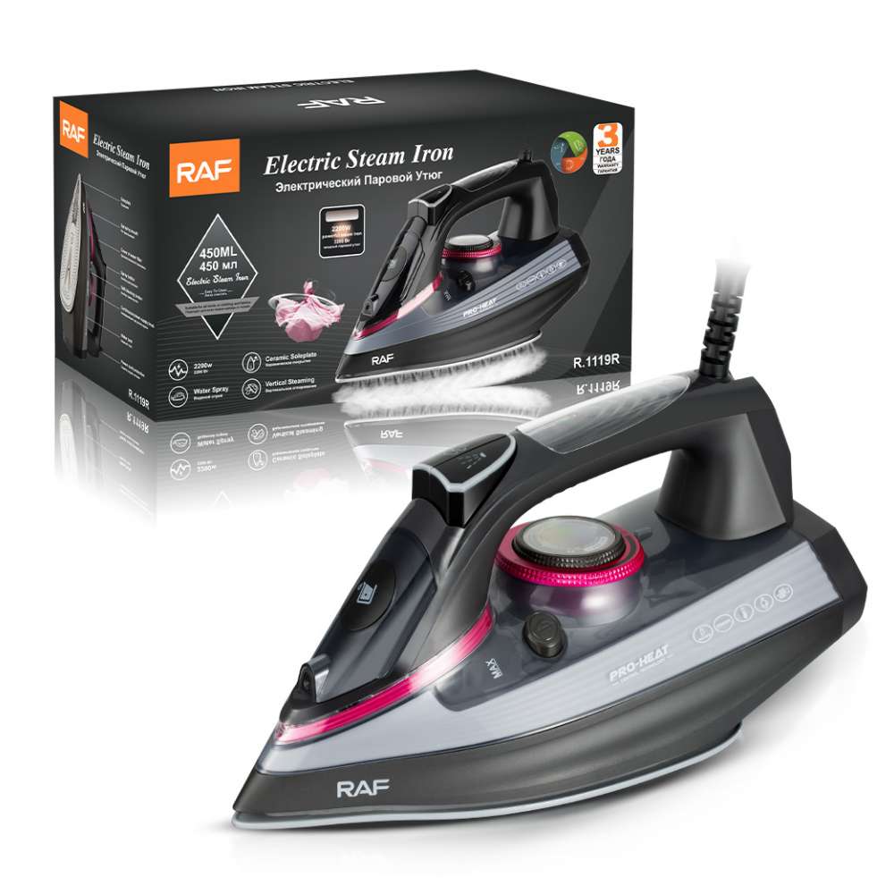 RAF R.1119R PEGLA NA PARU 2200-2400W Ova pegla na paru snage 2200-2400 W omogućava brzo i efikasno peglanje sa ravnomernom raspodelom pare. Rezervoar od 450 ml...